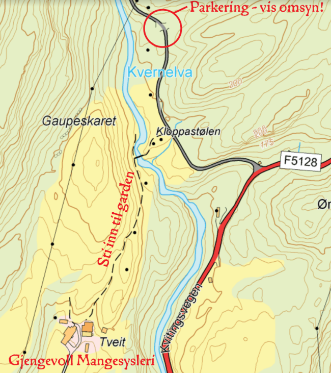 Oppmøte parkeringsplass for Gjengevoll Mangesysleri i Samnanger. Adresse: Tveit 31, 5650 Tysse. MEN dere må kjøre mot Kvitingen og følge kartet under for parkering etc. Dei har ikkje plass til å ta imot bilar på tunet og vi må difor parkere på nordsida av eigedomen, (langs vegen opp mot Totræna eller på plassen anvist i kartet). Dei møter oss slik at me finner rette stien, som er markert på kartet.