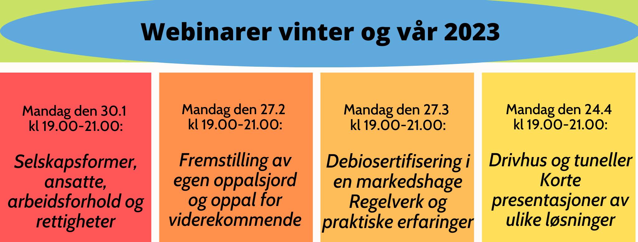PS: Arbeidsgruppen har fått inn mange ønsker og innspill til temaer på disse webinarene. Da vi kun skal ha fire gjennomføringer, har vi vært nødt til å velge en del fra. Men de temaer vi ikke kommer inn på i webinarene, vil vi etter beste evne forsøke å dekke på annet vis, bla. via en artikkelserie som vil bli publisert på markedshage.no i løpet av vinteren/våren.