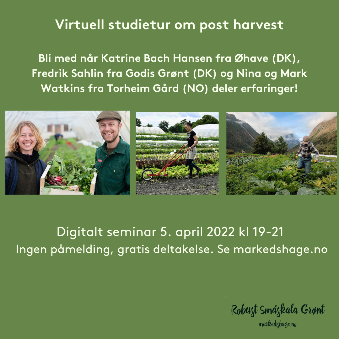 Post harvest – Grønnsakenes vei fra åker til kunder. Bli med når Katrine Bach Hansen fra Øhave (DK), Fredrik Sahlin fra Godis Grønt (DK) og Nina og Mark Watkins fra Torheim Gård (NO) vil vise bilder og dele deres erfaringer med Post harvest.