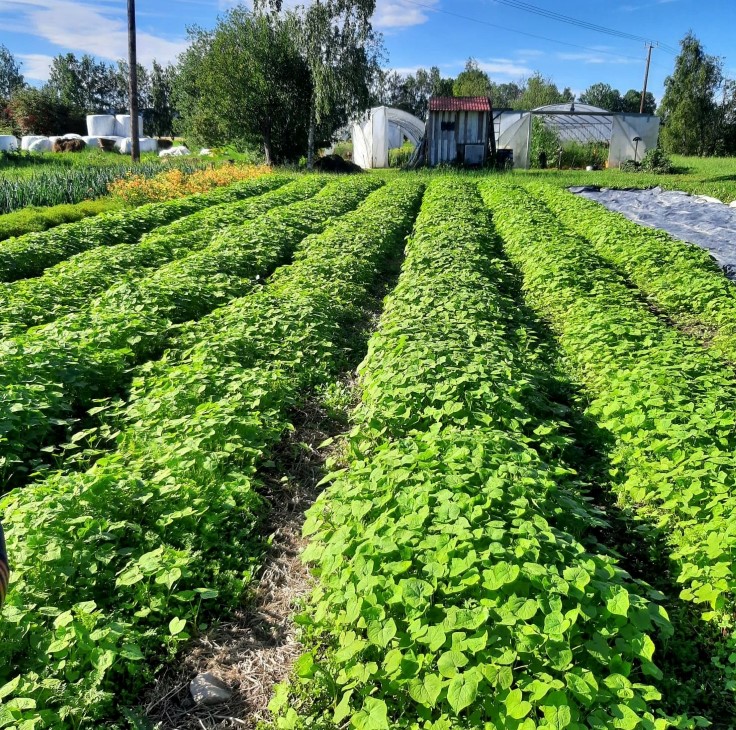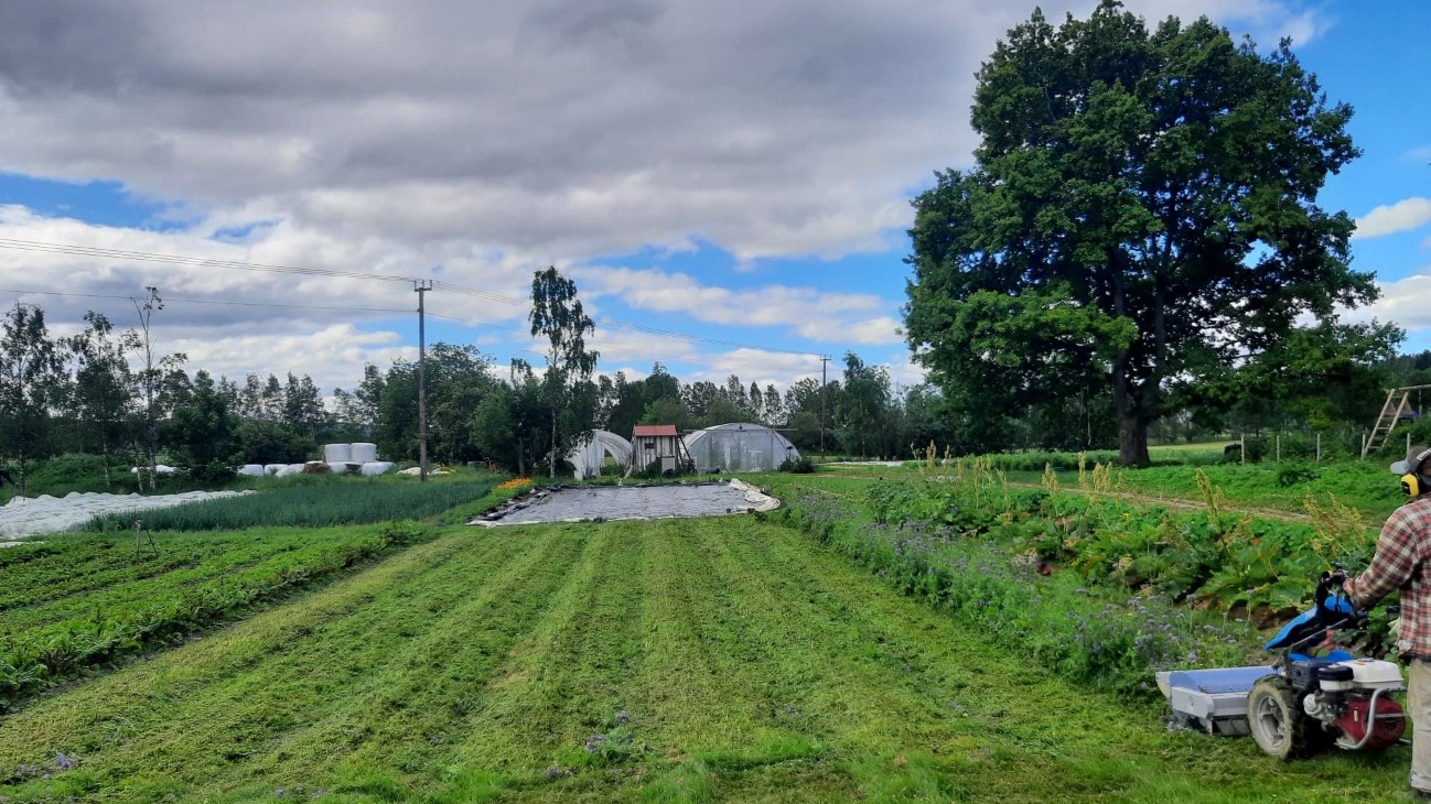 Så bruker vi jo veldig mye plass på grønngjødsel. 24 av 96 senger er grønngjødsel, og det har vært et fokus siden vi la opp de første sengene. Fordi vi har en så tung jord, må vi jobbe veldig aktivt med å tilføre organisk materiale. Og vi ser gode resultater – hvert år er det blitt enklere å jobbe med jorden her.