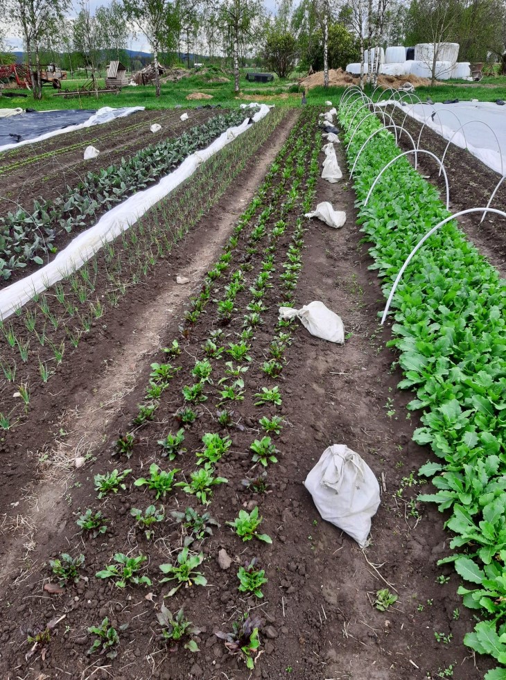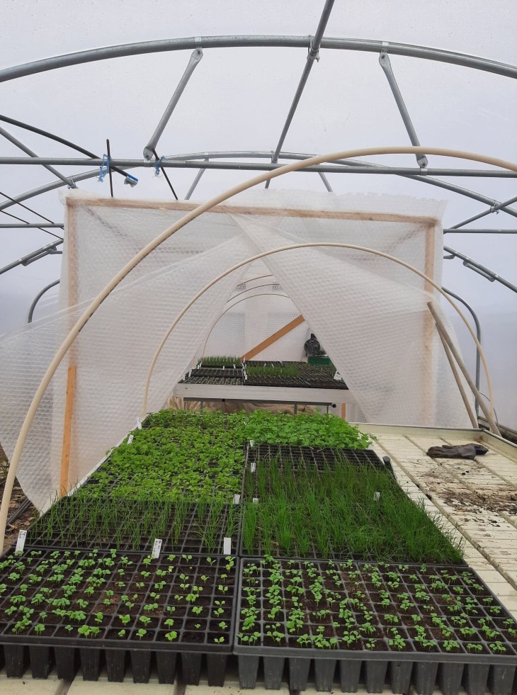Alt av kål, rødbeter osv. starter vi med inne i plasttunnelen under fiberduk-buer en gang i mars. Det er stress hvert år – jeg tror alltid at alle plantene skal gå i stokk og at hele produksjonen går i vasken. Men det har gått bra så langt, og jeg får veldig fine, kraftige planter. Det er imidlertid MYE jobb å ha planter ulike steder og holde øye med solen: ta fiberduken av og på, og åpne og lukke kuvøsen hele tiden. Det er vanskelig å kombinere med jobb ved siden av.