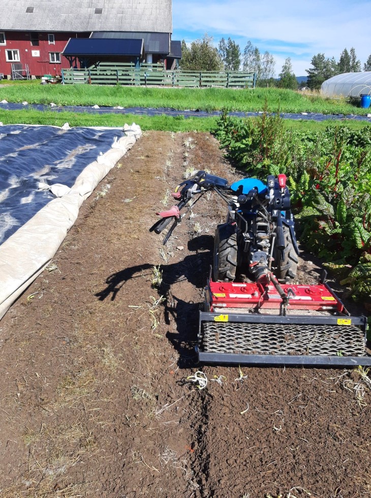 Tohjulstraktor: BCS-tohjulstraktoren har for oss, med vår jordtype vært en game changer. Vi har både plogen (som vi bruker veldig sjeldent), den horisontale fresen (lager perfekte såbedd), beitepusser og vanlig fres med dybderull. Vi importerte alt direkte fra Italia (Ciampelli), og betalte dermed nesten halvparten av hva det ville kostet i Norge. Veldig lurt, om jeg skal si det selv.
