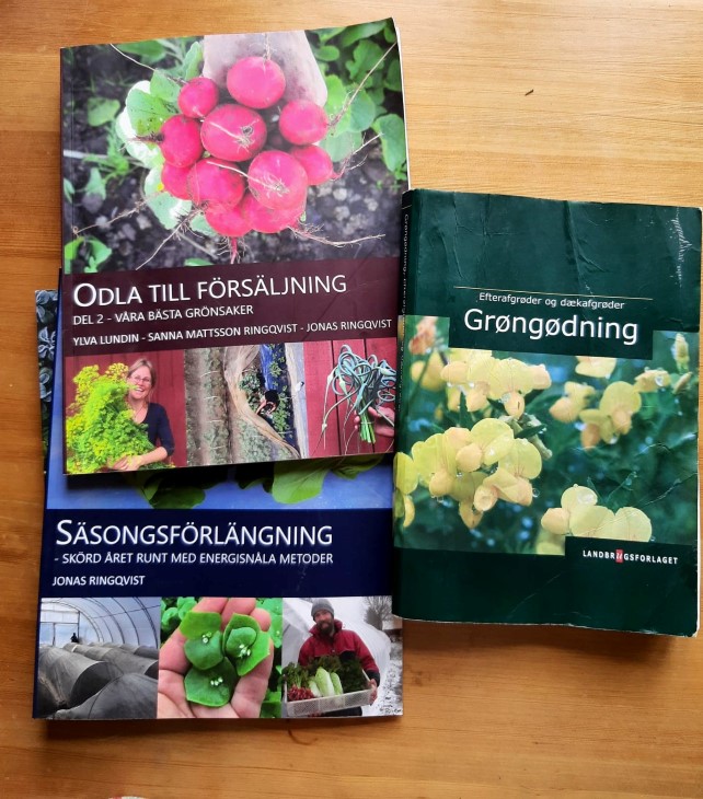 Ellers bruker jeg mye bøker under planlegging av markedshagedriften. Jonas Ringqvist har laget en bok som heter Odla til försäljning del 2, som er veldig bra som oppslagsverk. Alle bøkene hans er gode, men akkurat den bruker jeg mye. Og så har vi min bibel i grønngjødsling: «Efterafgrøder og dækafgrøder. Grøngjødsling.» utgitt av Landbrugsforlaget. Den er helt fantastisk og forteller deg alt om emnet. Bak i boken er det flere skjemaer (om dekkevne, N-binding osv) som har blitt uvurderlige for oss.