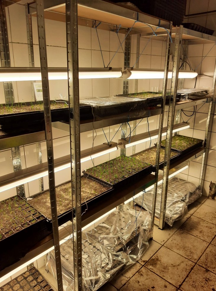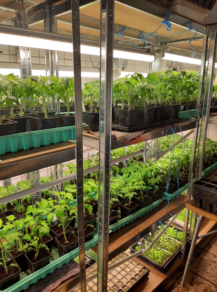 Jeg har innredet et oppalsrom til de tidligste vekstene (oppstart i slutten av februar) inne i det gamle melkerommet. Vi har de helt klassiske lysarmaturene fra Biltema og enkelte LED plantelys (men synes egentlig Biltema-løsningen er bedre). I tillegg har jeg bygget en kuvøse (3x3m) inne i plasttunnelen, kledd i bobleplast, med en temperaturstyrt varmeovn og et plantebord. Der setter jeg de varmekrevende plantene (purre, selleri, tomater) så fort jeg kan, og prøver å holde 10 grader som laveste temperatur. Det lykkes ikke alltid.