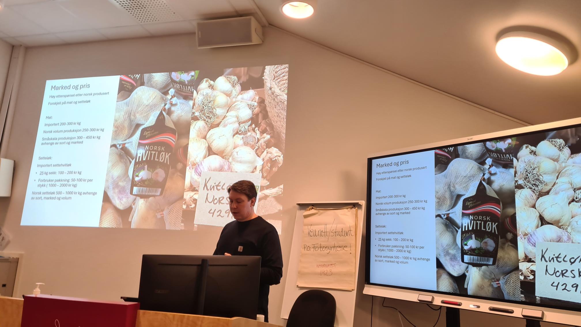 På søndag fikk vi besøk av Fredrik Magnussen som delte erfaringer og tips om dyrking av hvitløk. Han deltar også i et nasjonalt hvitløksprosjekt og arbeider for dyrking av hvitløk i Norge og å bruke et større mangfold av hvitløkssorter.  Foto: Linden.