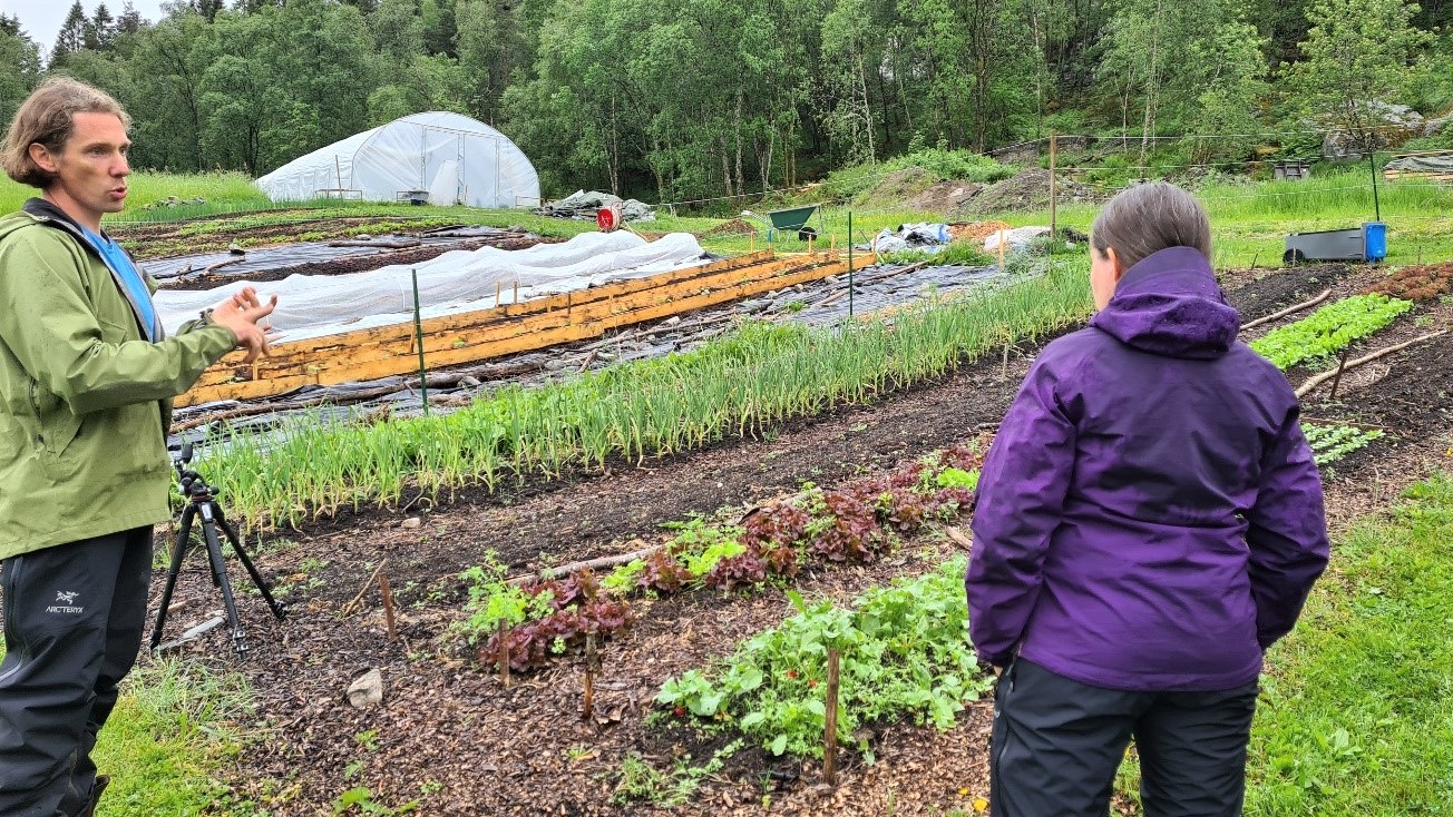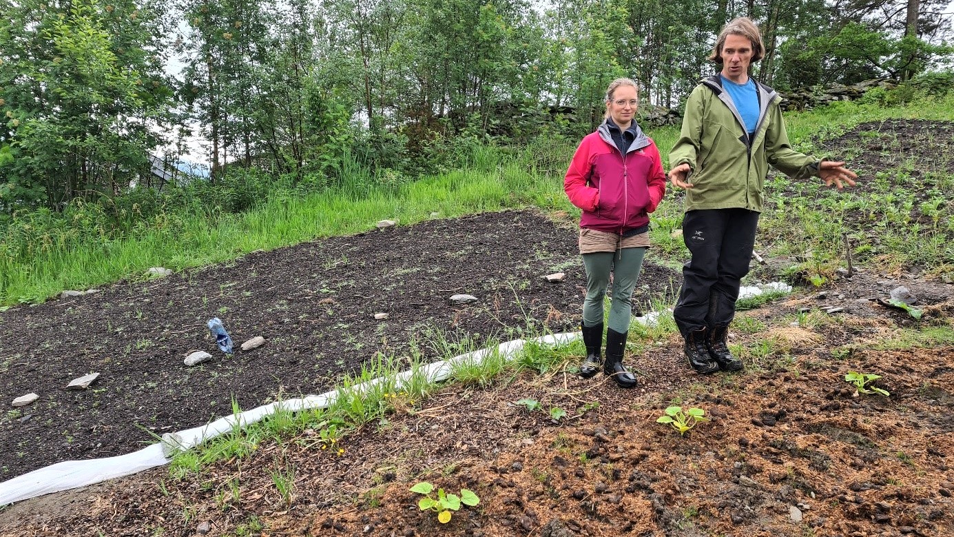 Markvandring hjå Simon og Jovana Wolff på Stølen gard i Strandvik, Bjørnafjorden kommune, den 10. juni 2021. Dei etablerte ein marknadshage i 2021 og skal bygge eit geitfefjøs og drive mjølkeforelding, med oppstartsstøtte frå Innovasjon Norge.
