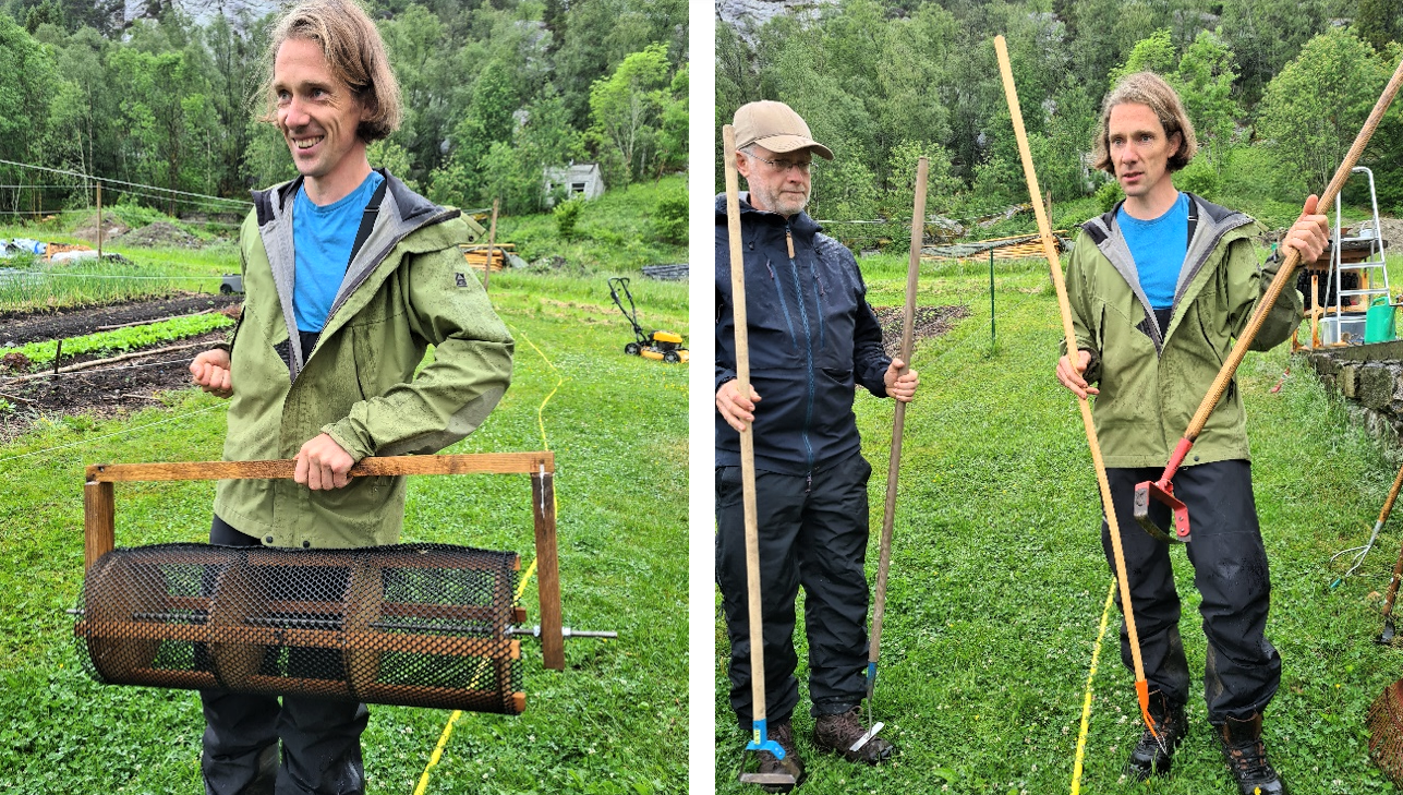 Rådgjevar Hans Gaffke og Simon Wolff diskuterer ulike handreiskap som ein bør ha i ein startfase av ein marknadshageproduksjon: både faste og gjenga hakker i ulike breidder (frå 12-17 cm) er viktige å ha, for å kunne tilpasse arbeidet mellom dei ulike radkulturane. Skal ugras handteringa bli effektiv, må ein unngå handluking, i så stor grad som mogleg.