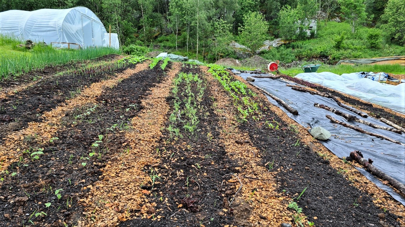 I år har dei ein grønsaksproduksjon produksjon på 21 faste bed på 10 meters lengde og 75 cm breidde, og testar ut ulike breidder og måtar å halde gangareala dekte på.